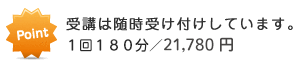 受講は随時受け付け 1回180分/21,780円~ 指針としてカリキュラムをご用意していますが、1コマ90分(2コマ~)お客様の必要コマ数だけ受講することができます。受講内容についてはご相談ください。 |