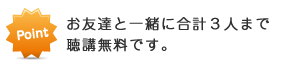 一緒に講義を聴きたい友達がいる。そんなときでもその場でレッスンを聴くだけなら無料です。指導はメインの方中心になります。 |